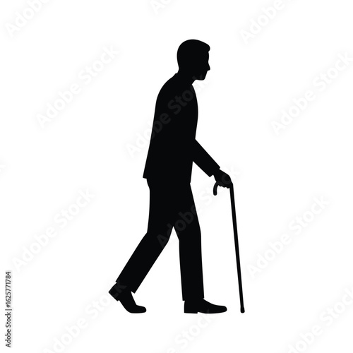 Silhouette of an old man walking with a cane, isolated on white background a senior person using a walking stick for support and mobility assistance
