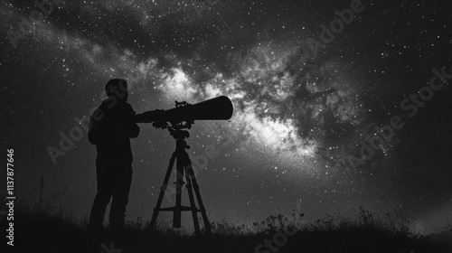 Silhouette of astronomer using telescope to observe the Milky Way at night.