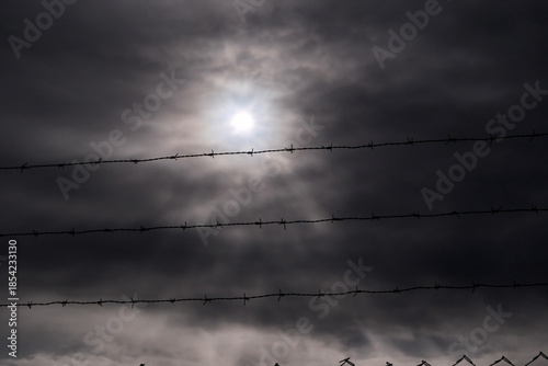 Silhouette of Barbed Wire Against Cloudy Sky with Sun. Barbed Wire Against Overcast Sky with Sun Breaking Through Clouds