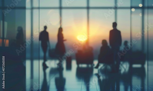 Silhouette of business people having a meeting against a modern office background with blurred abstract elements.
