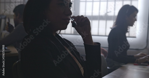 Silhouette of business woman talking on headset and typing on laptop computer. Female staff working