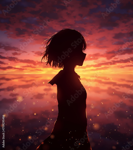 missy, silhouette, sunset, contrast, warm colors, impressionism, realism, profile, motion
