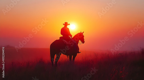 cowboy, dusk, cloud, horseback, art, western, beauty, peaceful, nature, animal, scenery, horizon, illustration, farm, silhouette, digital artwork, landscape, atmospheric, serene, field, golden hour, graphic design, ranch, rural, sky, orange, sunset, majestic, equestrian, horse, wildlife, riding, red