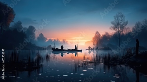 Silhouette of fishing people on boats and mist at lake with twilight sky. Generative AI