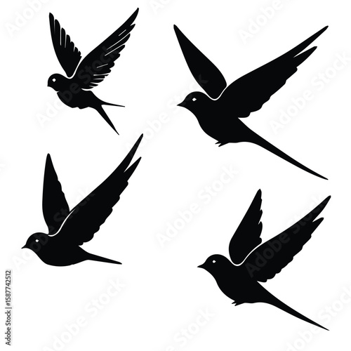 Silhouette of four birds in flight against a white background. Simple, stylized avian silhouettes in flight.