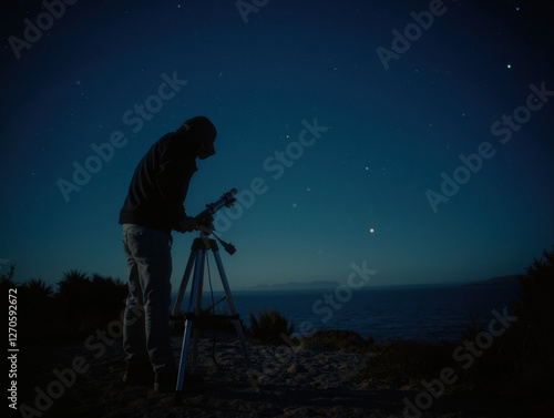 silhouette, stargazer, telescope, night, ocean, male, adult, astronomy, star, sky, celestial, observing, coastal, water, horizon, outdoors, exploration, dark, quiet, peaceful, serene, nature, science, equipment, evening, hobby, solitude, meditative, universe, space, distant, galaxy, planet, midnight, study, cosmos, hobbyist, contemplation, wonder, inspiration, discovery, adventure, calm, landscape, night time