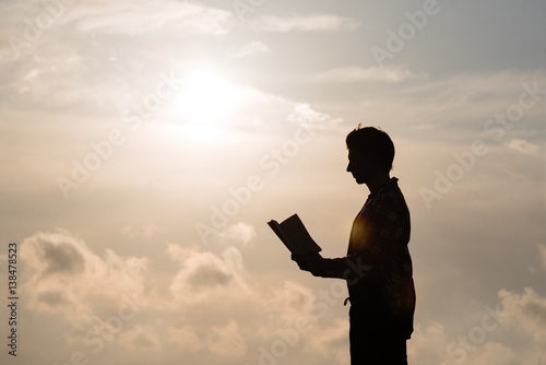 silhouette of man read book at sunset