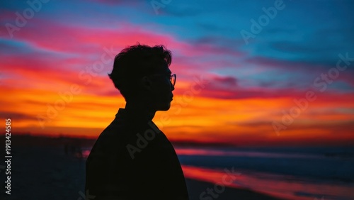 silhouette, man, sunset, beach, sky, goggles, contemplative, serene, ocean, sea, coastline, evening, dusk, horizon, colourful, gradient, water, sand, person, male, wear, scenic, landscape, outdoors, travel, vacation, relaxation, peaceful, tranquil, thinking, meditation, pensive