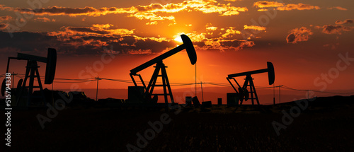 Silhouette of oil pumps. Landscape like Texas with glowing sky during sunset and some clouds. Oil and gas industry, drilling and oil production. concept. 3D illustration
