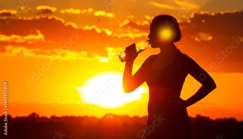 woman, sunset, silhouette, drinking water, hydratation, fitness, healthy lifestyle, orange sky, evening, sport, exercise, active, summer, warm colors, landscape, nature, bright, vibrant, relaxation, wellness, well-being, refreshed, energy, sun, horizon, background, water bottle, plastic bottle, athletic, female, person, human, figure, silhouetted, golden hour, heat, thirsty