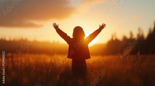 sunset, sunrise, field, person, silhouette, arms raised, sky, sun, warm, outdoors, nature, landscape, golden hour, light, backlit, rural, freedom, serenity, peace, travel, scenic, summer, horizon, grass, dawn, evening, meadow