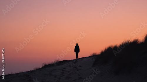 silhouette, person, walking, sand, dune, sunset, nature, peaceful, landscape, horizon, sky, dusk, twilight, evening, outdoors, scenic, calm, journey, exploration, adventure, travel, wanderlust, contemplation, isolation, beauty, environment, wilderness, desert, grass, shadow, minimalist, atmospheric, mood, inspiration, freedom, escape, quiet, introspection, colours