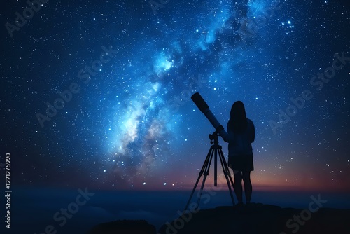 Silhouette of person with telescope observing bright Milky Way galaxy and stars in night sky. Perfect for astronomy, space exploration, and scientific discovery themes.