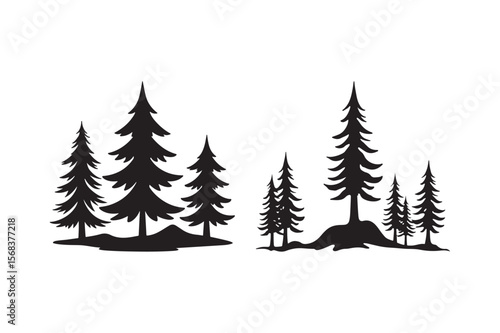 pine, tree, conifer, evergreen, forest, wood, nature, landscape, silhouette, graphic, illustration, black, and, white, monochrome, vector, design, element, wilderness, scenic, rocky, ground, terrain, stylised, minimalist, isolated, clutter, free, simple, icon, symbol, art, drawing, scene