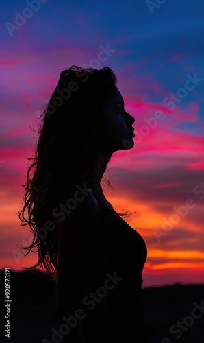 Silhouette of woman against vibrant sunset sky Long hair flowing Purple and orange clouds Dramatic nature backdrop Profile pose