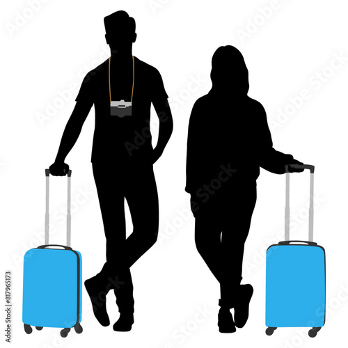 Silhouette of young man and woman tourists with smartphones and passports. Travelers going on trip in casual clothes with a suitcase and tickets. Vector illustration set isolated on white