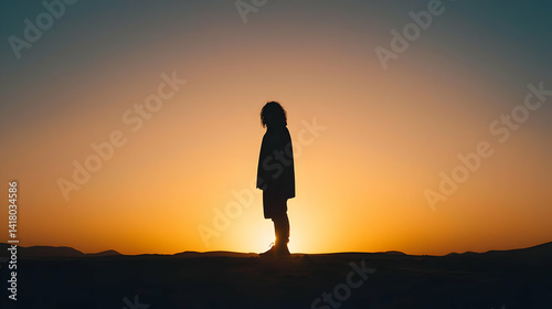 silhouette, sunset, person, orange, yellow, golden hour, horizon, sky, landscape, desert, outdoors, warm colors, dramatic, golden light, alone, contemplative, stillness, solitude, hope, peace, nature, photo, minimalist, simple, figure, standing, profile, warmth, light, shadow, desolate, dramatic sky, sun, dusk, warm light, quiet, serene