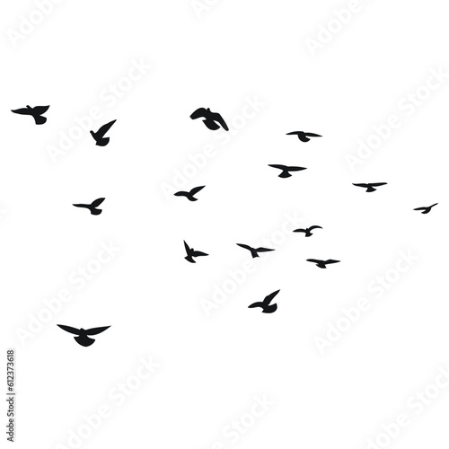 Silhouette sketch of a flock of flying birds, flight in different positions. Hover, soaring, landing, flying, flutter