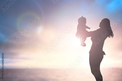 Silhouette young woman happy fun with cute daughter in summer sunset beach nature background concept - child in hug family, international mother day, motherhood love kid together.