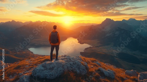 Silhouetted against the vibrant sunset, a person stands on a rocky outcrop, gazing over the serene lake surrounded by majestic mountains