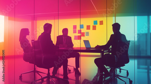 Silhouetted Business Team Brainstorming In Colorful Gradient Office