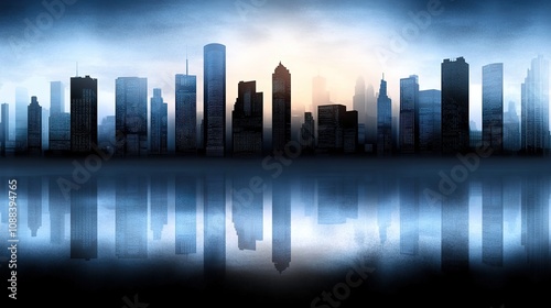 Silhouetted Cityscape at Dawn with Reflective Water Surface and Soft Blue Tones, Evoking a Calm and Serene Urban Environment