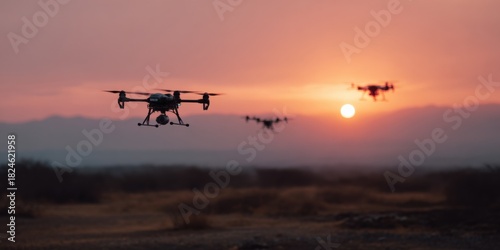 sunset, silhouette, landscape, hovering, sky, flying, technology, remote, evening, horizon, dawn, aerial, unmanned, vehicle, exploration, nature, peaceful, panoramic, scenic, field, innovation, modern, futuristic, soft, light, skyward, desert, calmness, automation, adventure, surveying, wilderness, calm, serene, pink, orange, quiet, observation, sun, glow, atmospheric, journey