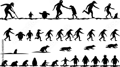 silhouette, evolution, human, penguin, walking, running, standing, sitting, baby, children, adult, animal, bird, mammal, marine animal, stick figure, pose, stage, development, interaction, reaching, digging, swimming, laying, crawling, monochrome, black-and-white, isolated, group, sequence, progression, transformation, adaptation, wildlife, nature, creature, aquatic, marin, fauna, illustration