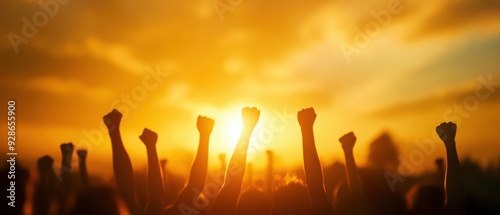 Silhouetted hands raised in unity against a stunning golden sunset, symbolizing hope, change, and collective strength.
