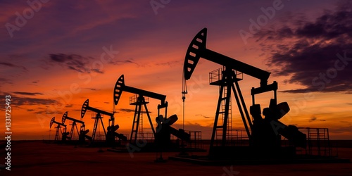 Silhouetted Oil Pumpjacks Operating Against a Vibrant Sunset Sky, oil pumpjack, oil drilling, crude oil extraction, petroleum industry, oil field