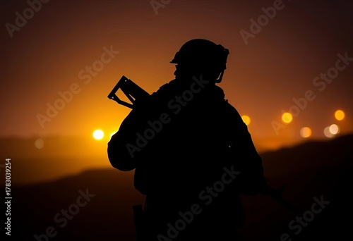 Silhouetted soldier with rifle, vigilant stance at night, military, danger