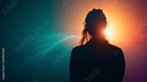 silhouette, woman, female, sunset, sunrise, light, hope, dream, future, background, abstract, artistic, vibrant, colourful, bright, saturated, digital artwork, texture, energy, optimism, mystery, shadow, concept, imagination, inspiration, design, wallpaper, modern, style, graphic, illustration