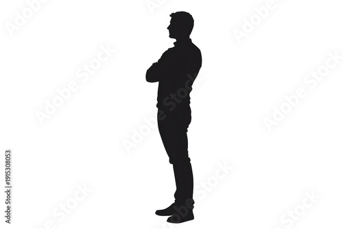 silhouette, contemplation, profile, man, thinking, thought, reflective, standing, arms crossed, introspection, thoughtful, calm, quiet, observing, pondering, contemplating, sharpened, resolve, strength, confident, pose, figure, isolated, solid, minimalistic, simple, elegant, black, shape, contour, outline, human, adult, male, person, individual, self, inner, quietude, still, portrait, composition, expression, mood, style, classic, monochrome, detail