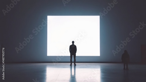 silhouette, screen, light, dark, room, gallery, white, bright, canvas, shadow, human, people, person, man, figure, art, modern, minimalism, interior, space, floor, background, design, contrast, mystery, enigma, thought, contemplation, display, artwork, exhibition, large, square, building, image, photo, black