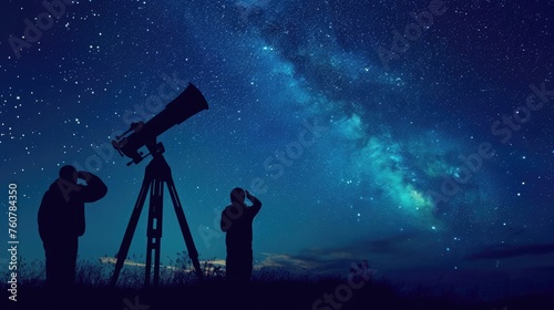Silhouettes of an astronomer and companion stand beside a telescope, gazing up at the vast tapestry of the Milky Way, inviting discoveries in the stillness of the night, astrotourism,