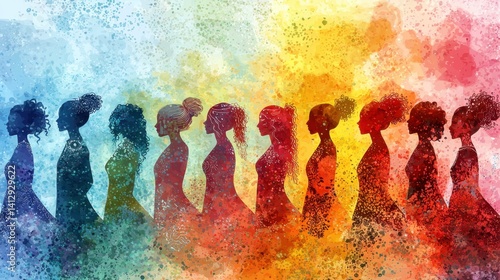 Silhouettes of diverse women are displayed in a colorful gradient, showcasing unity and empowerment. The artwork captures strength and diversity in an artistic representation