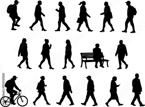 person, silhouette, walking, sitting, riding, bicycle, pedestrian, bench, group, crowd, vector, graphic, illustration, male, female, business, travel, urban, city, street, activity, bag, phone, communication, transit, transportation, motion, move, park, outdoors, clothing, style, isolated, people, body, shape, black, white, design, icon