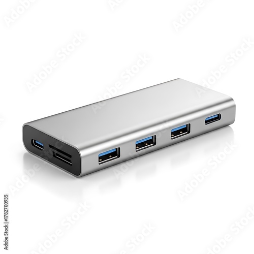 silver, technology, electronic device, data transfer, connectivity, port, adapter, hub, device, contraption, office, workspace, modern, sleek, metallic, white background, studio shot, isolated, digital, portable, expansion, connection, peripheral, storage, media