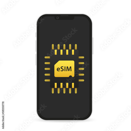 SIM Mobile connection. eSIM card chip sign. Mobile device with a chip eSIM. Embedded SIM. New mobile communication technology concept. Vector illustration
