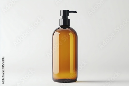 Simple amber glass bottle with a black pump dispenser against a stark white background, perfect for showcasing a variety of liquid toiletries, from hand soap to luxurious body washes