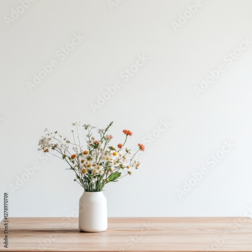 Simple arrangement of flower stems in a white vase on a wooden table in a minimalistic setting