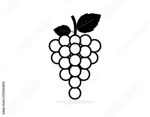 Simple, black and white illustration of a bunch of grapes with leaves on a white background