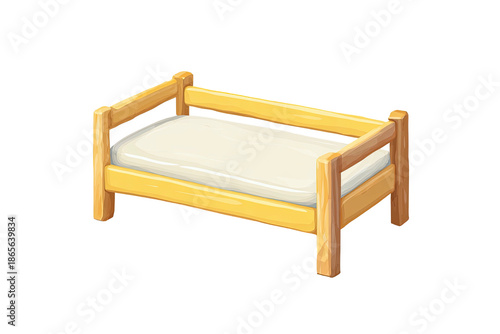 bed, wooden, furniture, minimalist, simple, cartoon, illustration, light, mattress, pillow, sleep, rest, comfortable, cosy, quiet, relaxation, dream, bedchamber, lodging, accommodation, miniature, small, children, baby, doll, toy, structure, frame, yellow, beige, cushion, rectangular, clean, neat, tidy, empty, nobody, domestic, indoor, object, isolated, background, plain, flat, graphic, drawing, digital, art, render