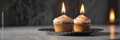 Simple cupcake on a shiny plate with a single flame, metal finish, decorative plate, solo element