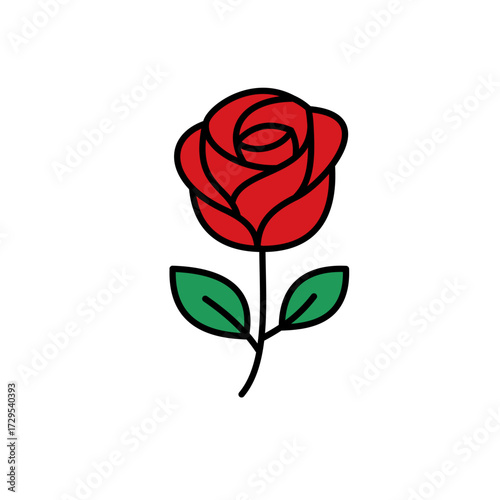 Simple flat style red rose flower icon with green leaves isolated on white background. Perfect for Valentine’s Day, romance, love, nature, and botanical design themes