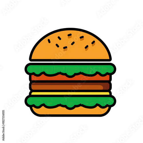 burger, hamburger, food, fast food, icon, vector, sandwich, junk food, delicious, appetising, snack, meal, epicure, sesame seeds, lettuce, tomatoes, patty, cheese, minimalist, graphic, illustration, isolated, simple, clean, design element, digital artwork, take-away, take-out, epicure, savoury, dish