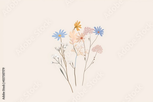 Simple floral arrangement with blue, pink, and yellow flowers on a white background.