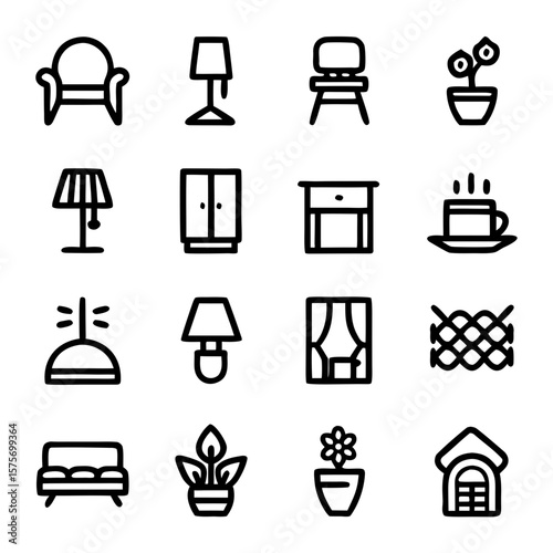 Simple Household Items in Single-Line Sketch Style – Minimalist Chair, Lamp, Cup, and Plant Illustrations for Logo, Branding, Wall Art, and Interior Design