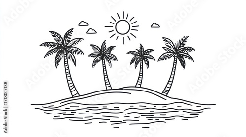 island, beach, palm, tropical, ocean, sun, wave, vignetting, design, element, summer, vacation, paradise, travel, holiday, relax, get-away, coast, sea, water, nature, landscape, illustration, graphic, art, drawing, line, simple, minimalist, vector, clip art, image, background, print, card, poster, tour tourism, exotic, serene, peaceful, calm, happy, freedom, escape