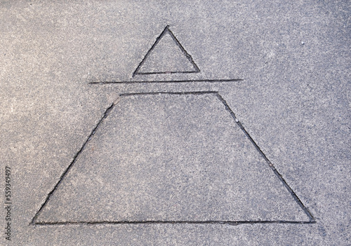 Simple pyramid and triangle symbol imprinted in concrete pavement background texture